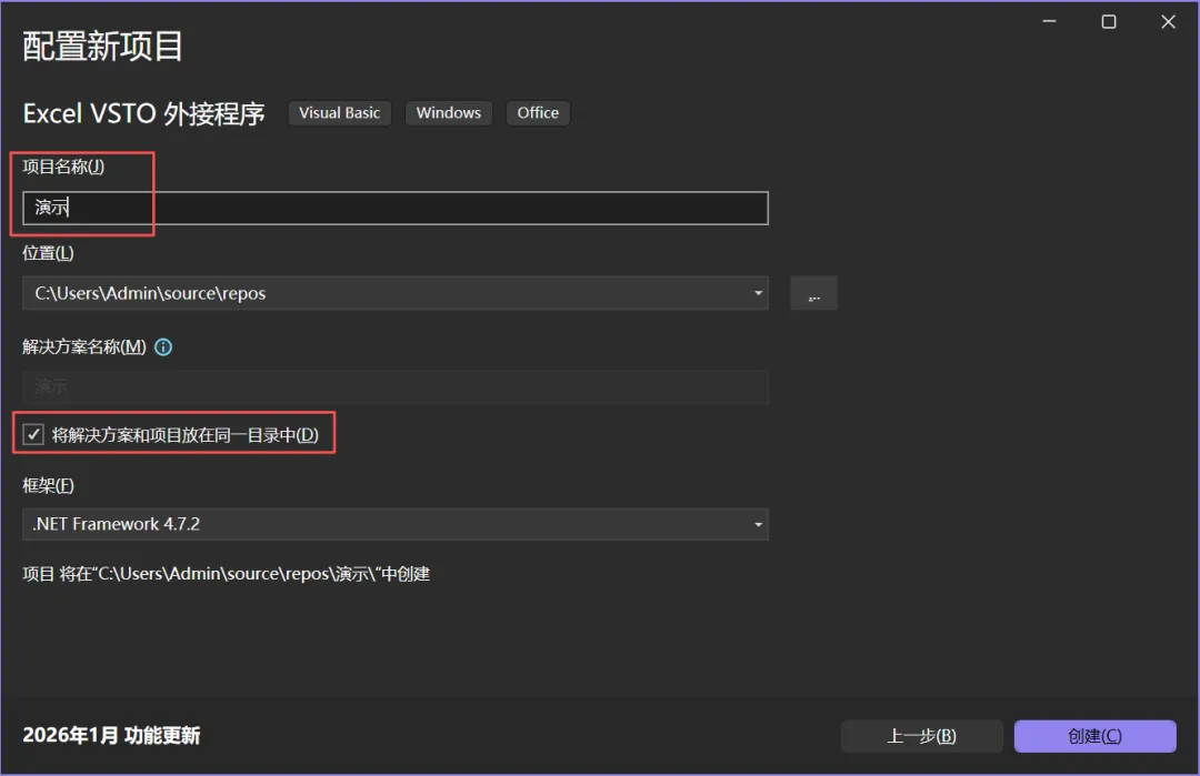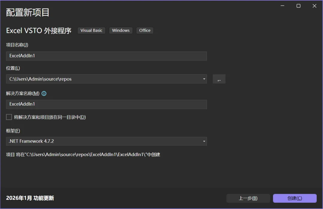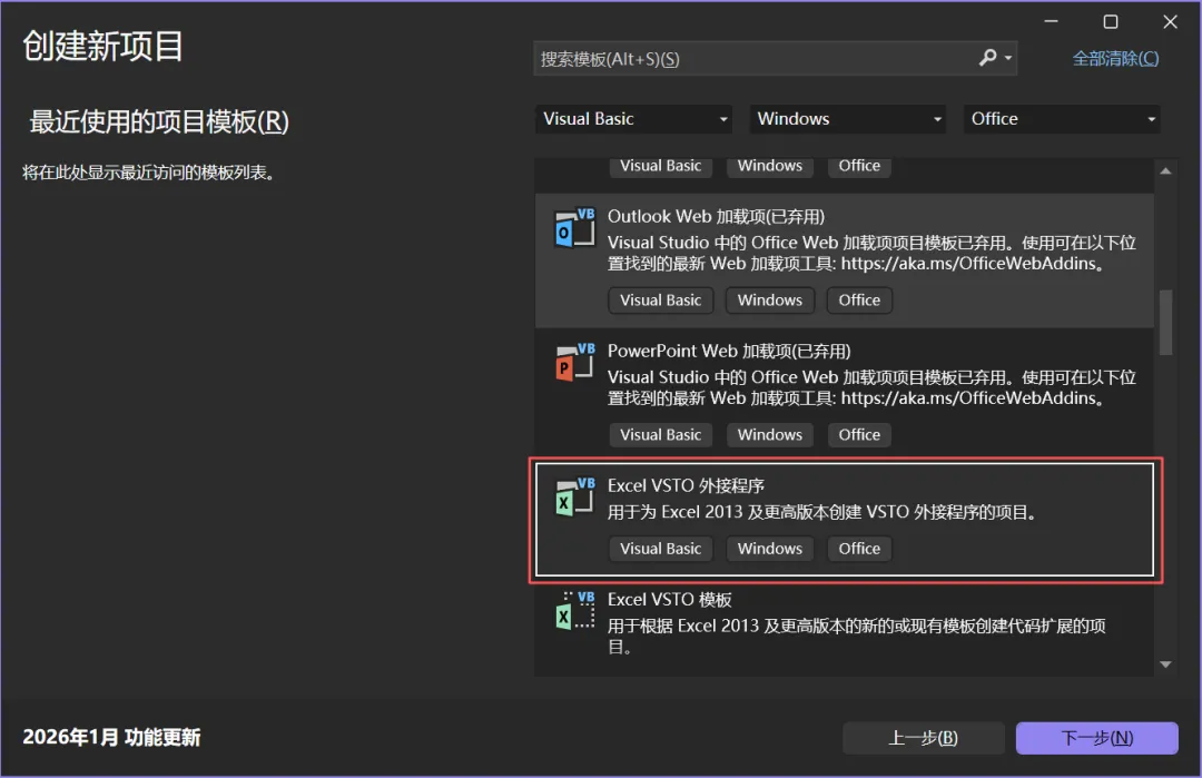 8、选择项目模板 在搜索结果中选择"Excel VSTO 外接程序",点击"下一步"