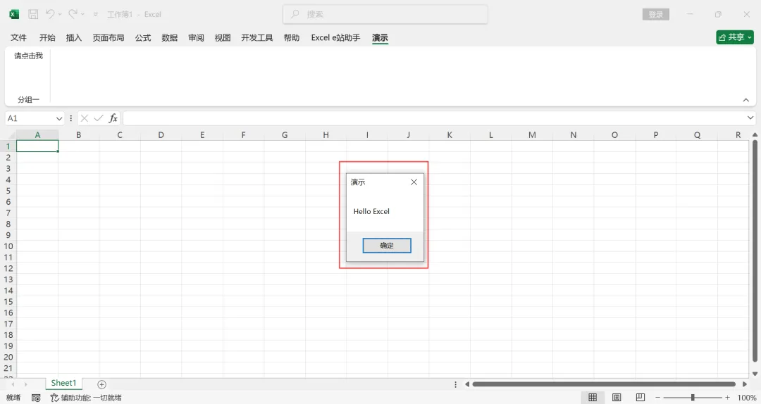 19、编写功能代码 在自动生成的button1_Click方法中,添加基础测试代码,例如:MessageBox.Show("Hello Excel");