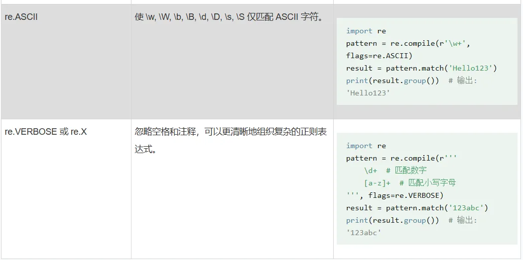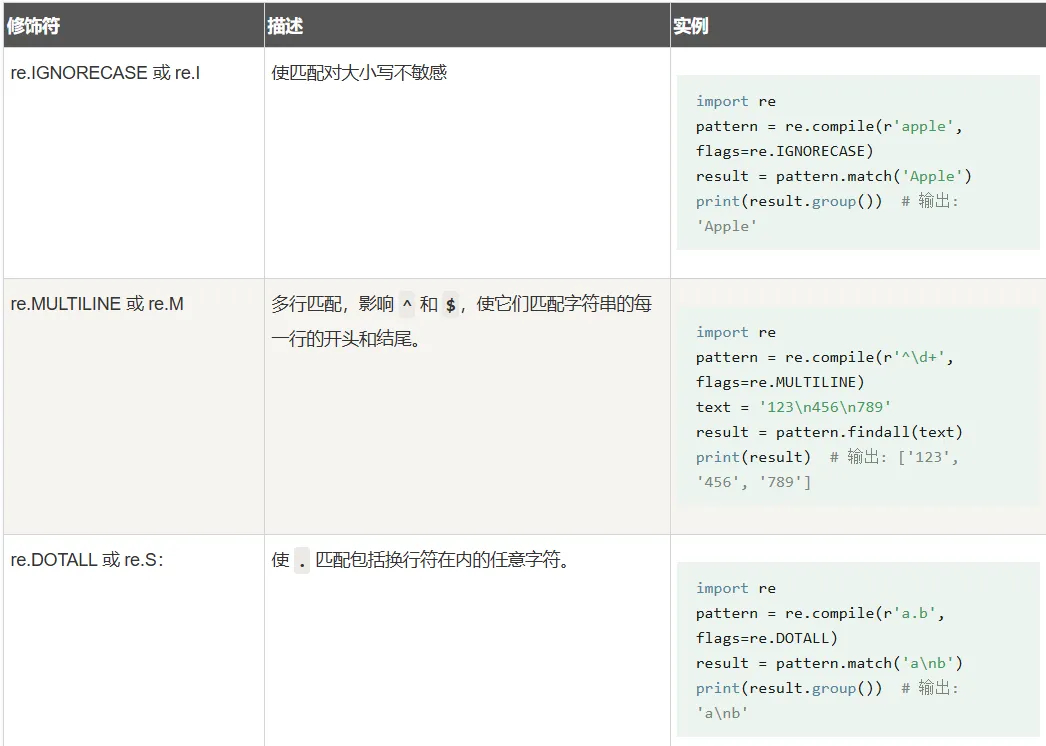 用一些可选标志修饰符来控制匹配的模式,标志可以单独使用,也可以通过按位或(|)组合使用。例如,re.IGNORECASE | re.MULTILINE 表示同时启用忽略大小写和多行模式text = "<div>content1</div><div>content2</div>"# 贪婪匹配 (默认)greedy = re.findall(r'<div>.*</div>', text)print("贪婪匹配:", greedy) # 输出: ['<div>content1</div><div>content2</div>']# 非贪婪匹配non_greedy = re.findall(r'<div>.*?</div>', text)print("非贪婪匹配:", non_greedy) # 输出: ['<div>content1</div>', '<div>content2</div>']