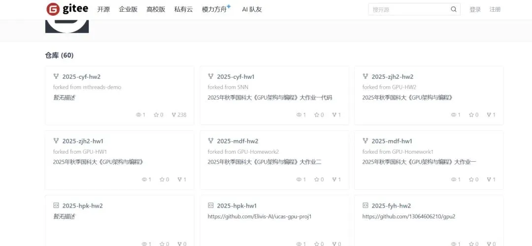 作为课程成果的核心承载平台,gitee.com/gpuap/仓库集群规模达60个,全面收录了课程两大核心大作业的优秀获奖代码。其中,大作业一聚焦基础GPU编程实践,代码以C/C++语言为主,覆盖GPU架构理解、并行编程基础等核心知识点;大作业二则围绕“GPU学习智能体”展开,收录了摩尔、沐曦、并行三大赛道的优质实现,涵盖LoRA低秩适应微调、Llama Factory/Unsloth等框架应用、vLLM/SGLang推理框架部署等关键技术,部分作品还融入了RAG、SFT、PPO优化及CUDA、Triton等GPU编程加速方案,部分成果附带UI界面设计,展现了本次GPU课程同学扎实的技术落地能力。