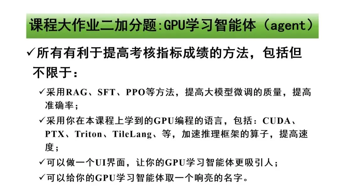 仓库由教学团队统筹管理,所有代码均源自课程严格评审后的获奖作品,经过实战检验,兼具规范性与创新性。代码以开源形式开放共享,不仅完整呈现了课程“理论+实践”的教学成果,更覆盖了GPU并行编程、大模型微调与推理优化等前沿技术场景,为行业人才培养提供了可直接参考的实践范例。