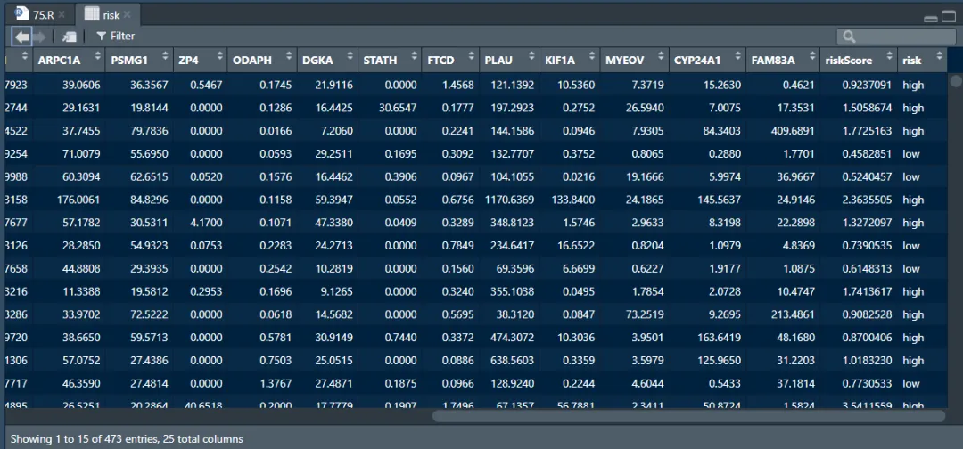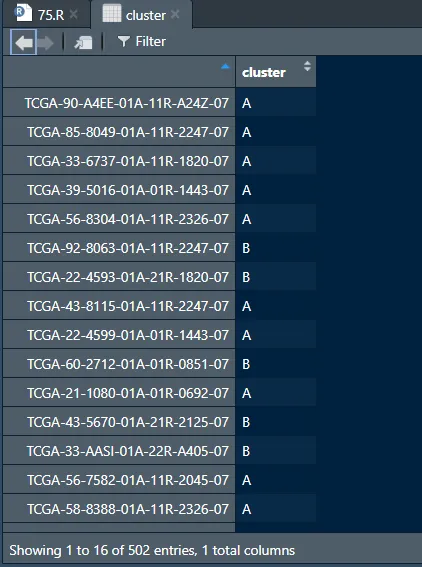 #正常和肿瘤数目,第14,15字符,01-09是癌症,10-19是正常,20-29是癌旁group=sapply(strsplit(rownames(cluster),"\\-"), "[", 4)group=sapply(strsplit(group,""), "[", 1)#将2变为1group=gsub("2", "1", group)#提取肿瘤样本cluster = cluster[group == 0,,drop=F]#转置cluster=t(cluster)#样本名仅保留前12字符colnames(cluster)=substr(colnames(cluster),1,12)#转置cluster=t(cluster)#合并数据sameSample=intersect(row.names(cluster), row.names(risk))rt=cbind(risk[sameSample,,drop=F], cluster[sameSample,,drop=F])