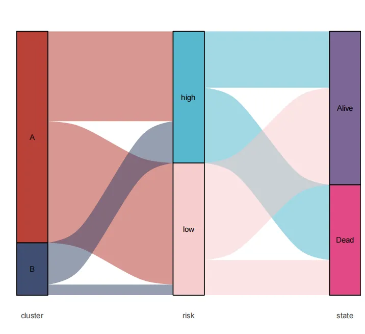 另一条主要路径是:Cluster B → Risk Low → State Alive(一条较宽的蓝色流带)。