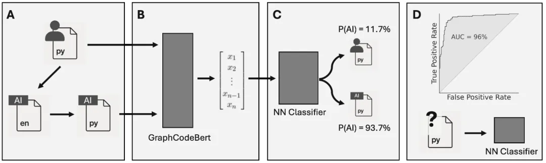 为克服传统调研方法的局限,研究团队设计了一套基于双LLM合成训练数据的分类器构建流程:先由一模型描述人类编写的Python函数,再由另一模型根据描述生成对应函数,从而构建出功能对齐但文本特征差异化的“人类-AI”配对数据。在此基础上,采用GraphCodeBert模型提取代码的词元、注释与数据流图特征,并训练神经网络进行分类。该方法实现了0.96的ROC AUC分数,显著提升了AI生成代码识别的可靠性与泛化能力。这一技术突破为本研究提供了核心数据基础,使大规模、动态追踪AI使用强度成为可能。