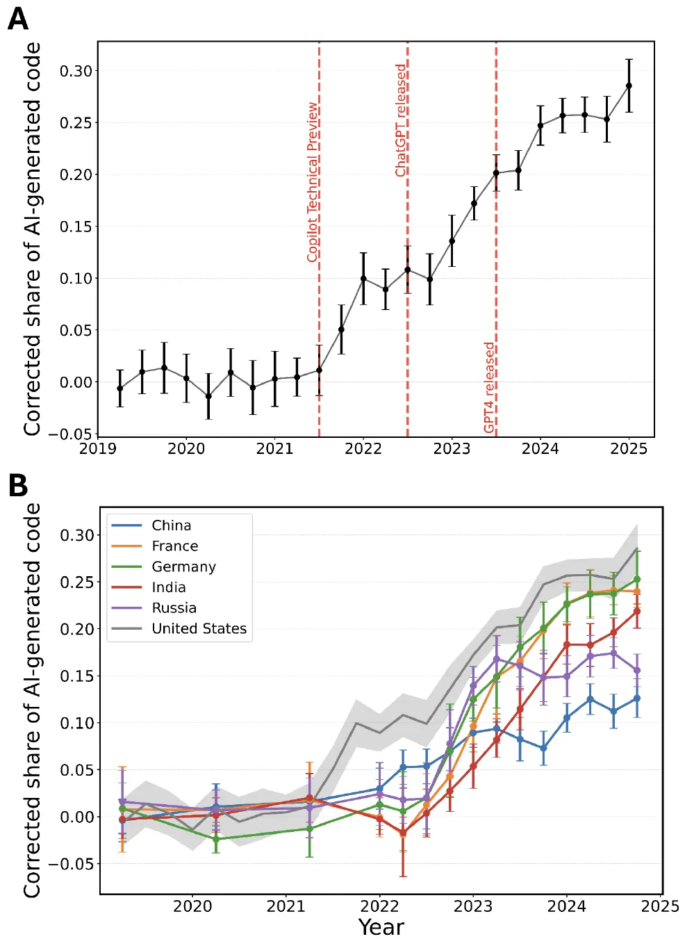该研究基于超过3000万次GitHub代码提交,首次构建可识别AI生成代码的机器学习分类器,揭示了全球六大国家AI编程采用率、扩散路径及其对开发者生产力的差异化影响。