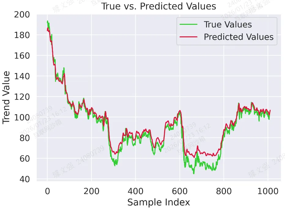 def visualize_results(loss_history, preds, trues):sns.set(font_scale=1.2)plt.rc('font', family=['Times New Roman', 'Simsun'], size=12)# 图 1:训练损失曲线# 模型在训练过程中损失的下降情况,说明模型不断优化拟合数据。plt.plot(loss_history, marker='o', color='dodgerblue', linestyle='-', linewidth=2)plt.title("Training Loss Curve")plt.xlabel("Epoch")plt.ylabel("MSE Loss")plt.tight_layout()plt.savefig('output_image1.png', dpi=300, format='png')plt.show()# 图 2:真实值与预测值对比曲线# 对比曲线直观展示模型预测趋势与真实数据的匹配情况,越接近表示模型效果越好。plt.plot(trues, label="True Values", color='limegreen')plt.plot(preds, label="Predicted Values", color='crimson')plt.title("True vs. Predicted Values")plt.xlabel("Sample Index")plt.ylabel("Trend Value")plt.legend()plt.tight_layout()plt.savefig('output_image2.png', dpi=300, format='png')plt.show()