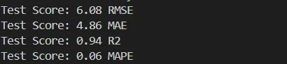 testScore1 = math.sqrt(mean_squared_error(preds_test, trues_test))print('Test Score: %.2f RMSE' % (testScore1))testScore2 = mean_absolute_error(preds_test, trues_test)print('Test Score: %.2f MAE' % (testScore2))testScore3 = r2_score(preds_test, trues_test)print('Test Score: %.2f R2' % (testScore3))testScore4 = mean_absolute_percentage_error(preds_test, trues_test)print('Test Score: %.2f MAPE' % (testScore4))