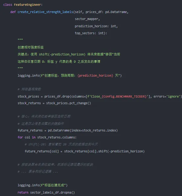 定义未来一段时间(如未来20个交易日)板块收益率超越市场基准的板块为“强势板块”,标签设为1,其余为0。需严格保证标签生成仅使用对应时间段前的数据,例如用t日及之前的数据预测t+1日至t+20日的表现,确保无信息泄露。