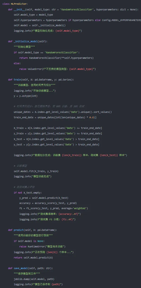 采用随机森林分类器进行训练,因其能处理非线性关系且不易过拟合。将数据集按时间顺序划分为训练集和测试集(如前70%时间训练,后30%测试)。输入特征为板块技术指标,输出为板块强势概率。通过特征重要性分析可验证逻辑合理性(如动量因子权重较高)。