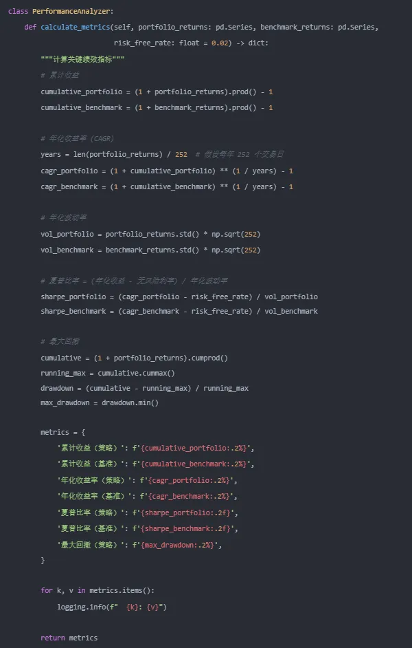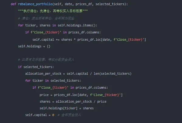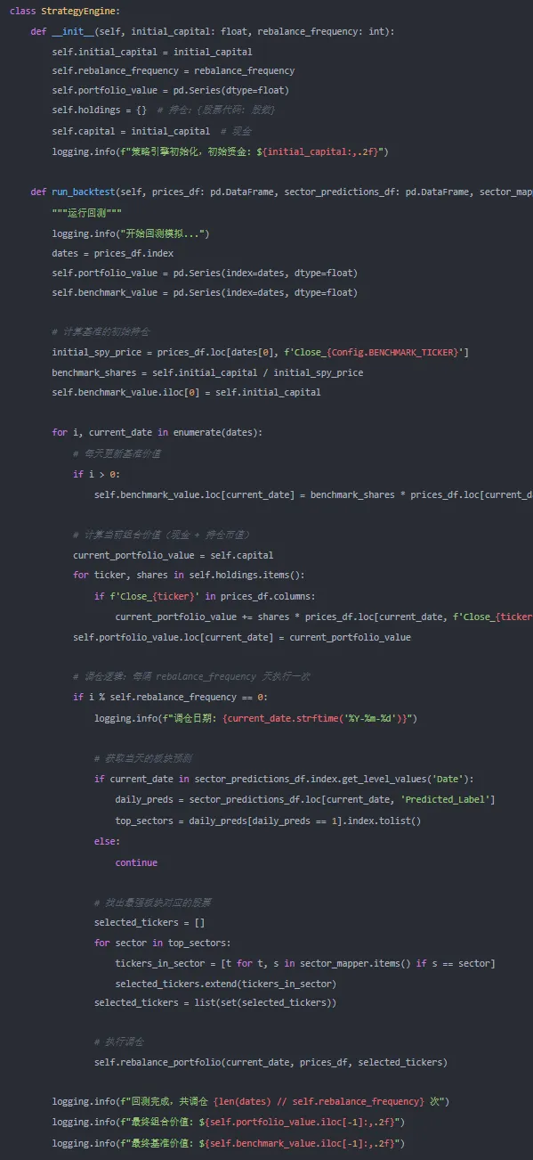 设置每月调仓,选择模型预测概率最高的前3个板块等权配置。回测中需考虑交易成本(如千分之三)。评估指标包括: