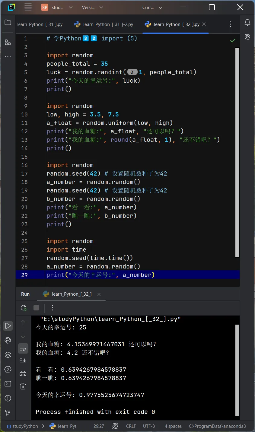 import randomimport timerandom.seed(time.time())a_number = random.random()print("今天的幸运号: ", a_number)