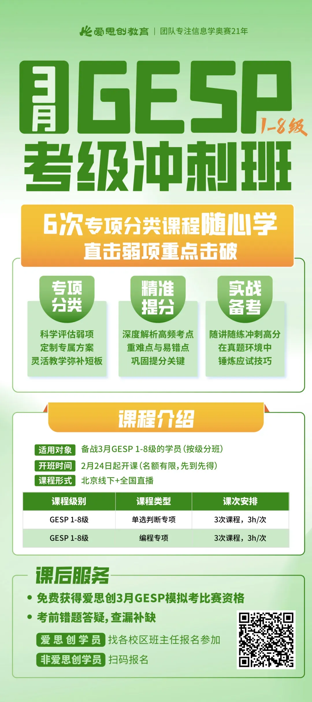 爱思创针对【单选判断+编程】题型专项开设6次课程的考前冲刺课程,从基础巩固到冲刺提分,一步到位,帮娃稳稳拿捏考试,家长省心又省力!