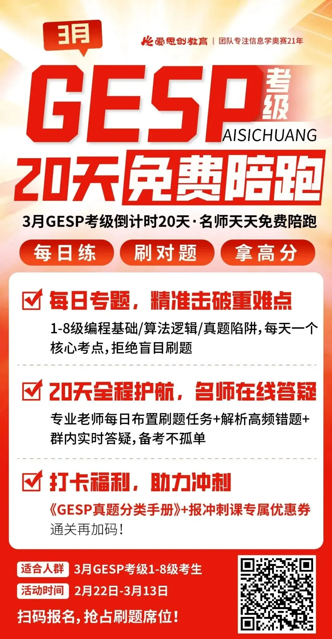 在考前20天(2月22日-3月13日),我们将为所有考冲班学生启动 “天天陪考” 计划,每个参与的孩子都将有专属班级服务,每日发布分级专题刷题任务,配套名师逐题解析和实时答疑,让孩子冲刺有目标、有反馈、不孤单。