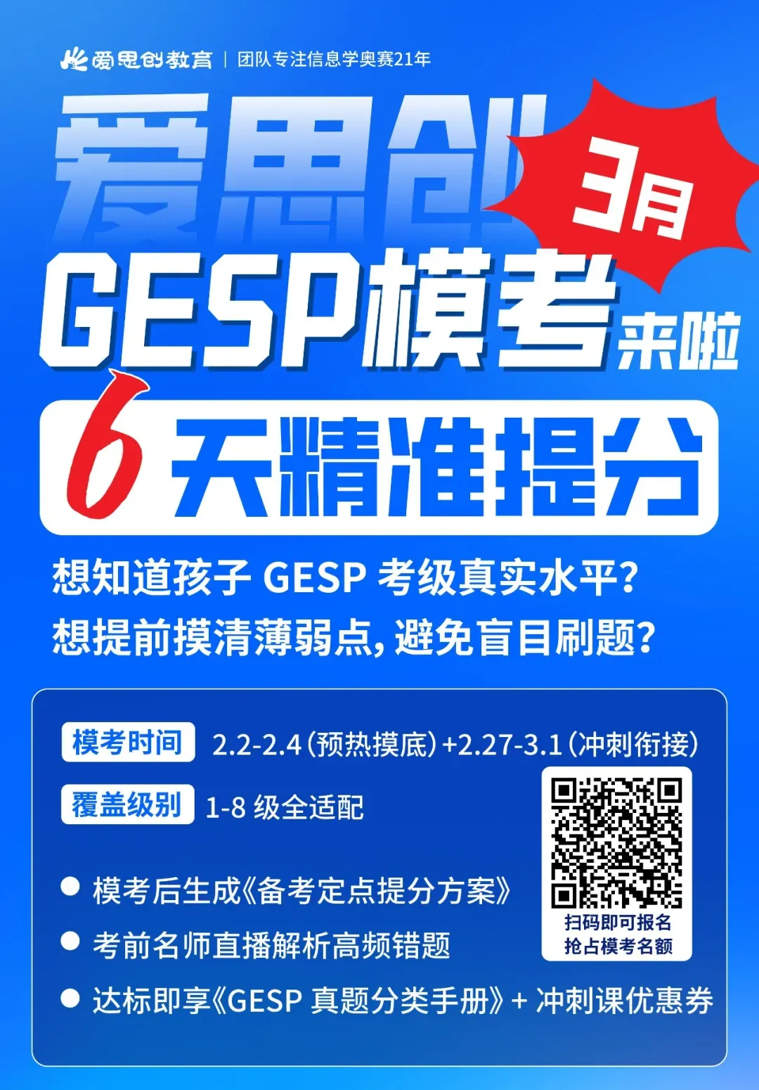 我们将重磅推出2轮原创全真模拟测试!严格还原GESP考试的时长、题型与官方难度,考后不仅提供详尽答案详解,更有专属老师针对疑难知识点精准答疑,帮孩子提前熟悉考场节奏、缓解应考紧张,备考更有底气。