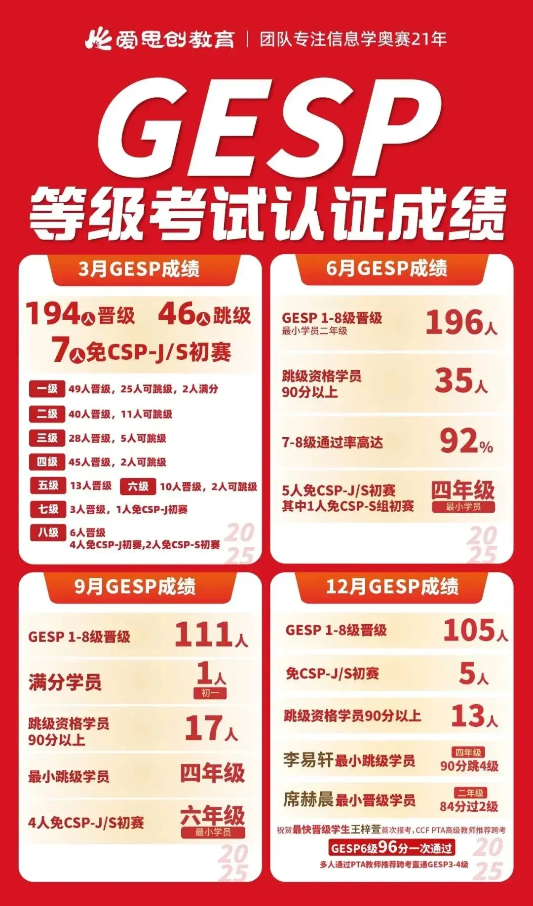 2025年,GESP1-8考级中爱思创晋级人数达到606人,跳级111人。