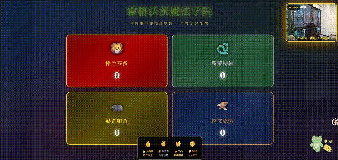 提示词:帮我搭建一个使用不同的手势的加分网站,风格为哈利波特,一共有4个学院,配色调整为神秘的魔法世界的风格。并且在右上角添加 live camera feed ,叠加 MediaPipe 检测到的手部骨架(关节点及连接线)。给哪个学院加分就会出现哪个学院的名字,一次加十分。(是不是很简单又特别有意思呢!)