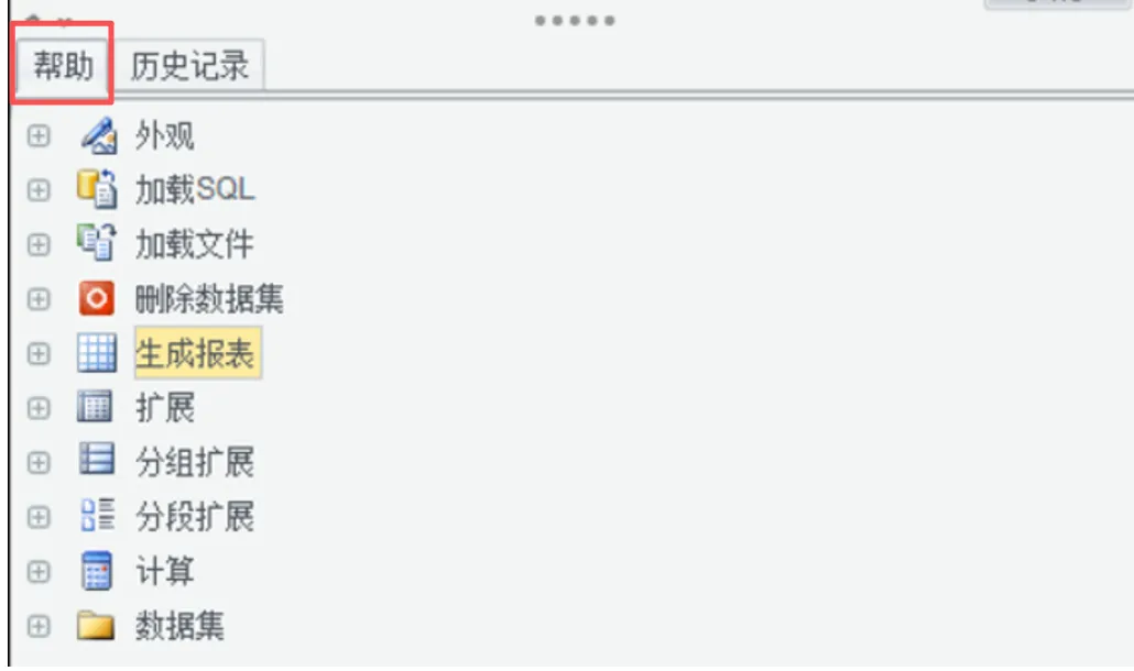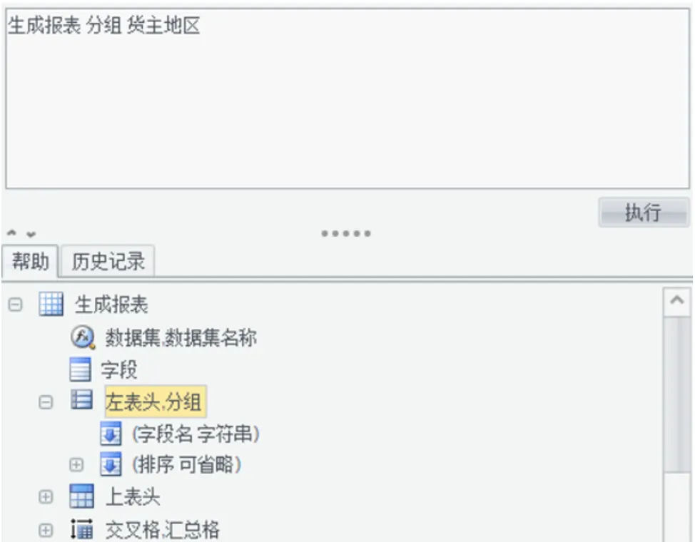 在 Copilot 界面输入任意功能关键词时,下方帮助区域会自动匹配并列出对应的完整命令词及所需参数,例如生成分组报表,在 Copilot 界面输入功能词“生成报表”后,帮助区域会即时显示该命令的完整结构,可以清晰看到需补充的参数项(如数据集名称、字段、分组、汇总格等),指引我们精准补充“分组 字段名”等关键信息,确保指令能被 Copilot 准确解析并写入计算表达式