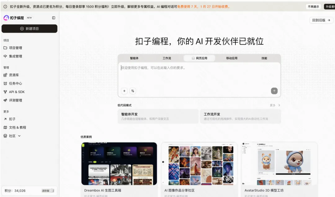 - Coze扣子 (coze.cn):最近出了2.0,在COZE编程这个产品里之前一直是做工作流和Agent,前段时间也支持了一句话做应用。