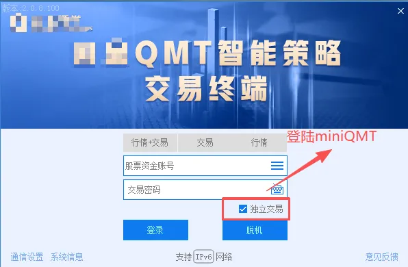 QMT登陆页面勾选独立交易就是miniQMT,后面的所有运行必须保持miniQMT登陆。