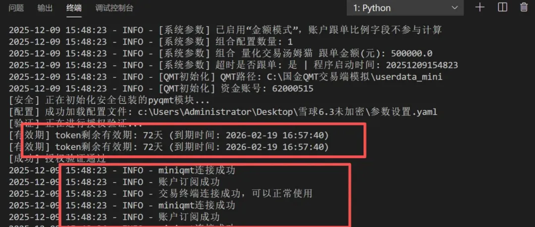 提示miniQMT链接成功、token有效期就是配置成功了,token也是文末联系作者领取。