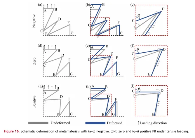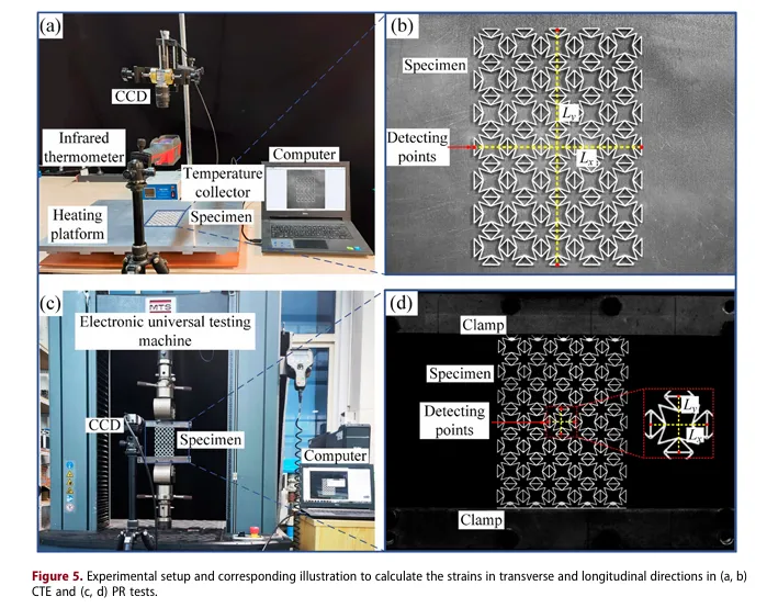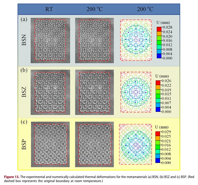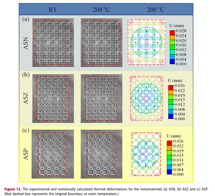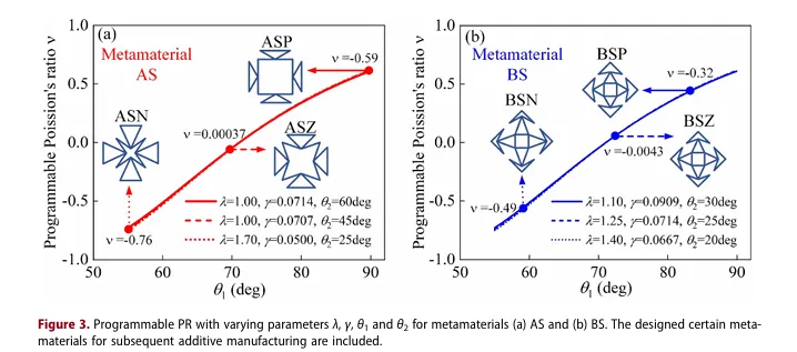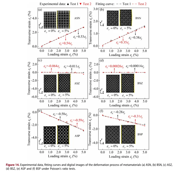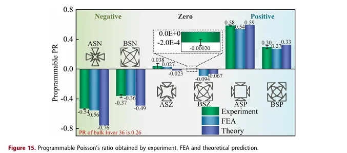 合理的工艺参数设计与扫描策略,可确保超材料具备优异的成型质量与均匀的微观组织结构。需要注意的是,熔池热扩散作用会导致部分粉末颗粒发生粘结,这一现象会轻微降低超材料的致密化程度与尺寸精度,在后续工艺优化中需针对性调整扫描速度与激光功率参数。得益于均匀的微观结构与优异的成型质量,所设计的超材料展现出各向同性的低热膨胀特性,其热膨胀系数可稳定控制在 2.0 ppm/°C 以下。值得关注的是,磁致体积收缩效应对原子振动的抑制作用会随温度升高而减弱,因此在高载荷温度条件下,超材料的热膨胀系数会出现相对增大的趋势,这一规律为超材料在高温工况下的应用提供了关键的性能参考依据。较高的尺寸精度是超材料实现可编程泊松比功能的重要前提。实验结果表明,该类超材料的泊松比可在 -0.54~+0.58 的区间内实现精准调控,这一结果不仅充分验证了超材料的泊松比可编程特性,也证明了前期理论设计方案的有效性与科学性。研究进一步揭示了超材料实现可编程泊松比的内在作用机理:内凹型拓扑结构是调控超材料横向应变的核心要素。当内凹结构的关键角度参数θ1取值较小时,会促进内凹结构发生横向延展,进而使超材料呈现负泊松比效应;反之,当θ1取值较大时,超材料的泊松比则会向正值区间偏移。