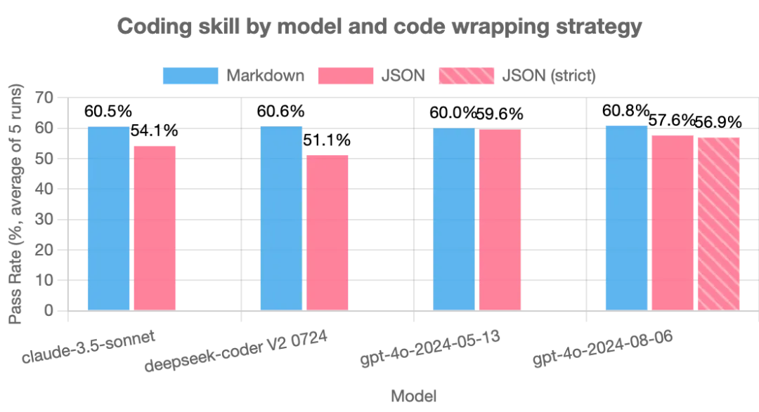 其余 3 个模型均出现显著下滑:claude-3-5-sonnet 和 deepseek-coder 的通过率暴跌,JSON 模式远低于 Markdown;
