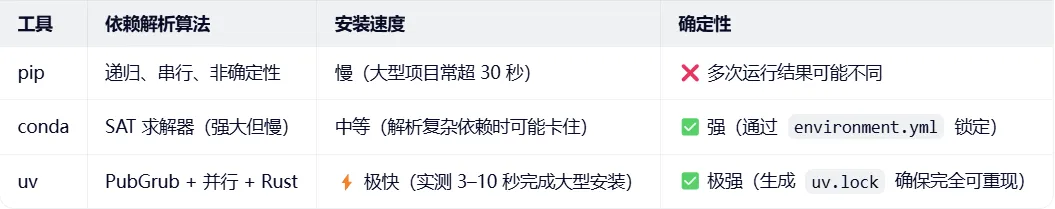 如果你的项目依赖 CUDA、MKL、FFmpeg 等系统库,只有 conda 能一站式解决;否则,uv 或 pip 更轻量。