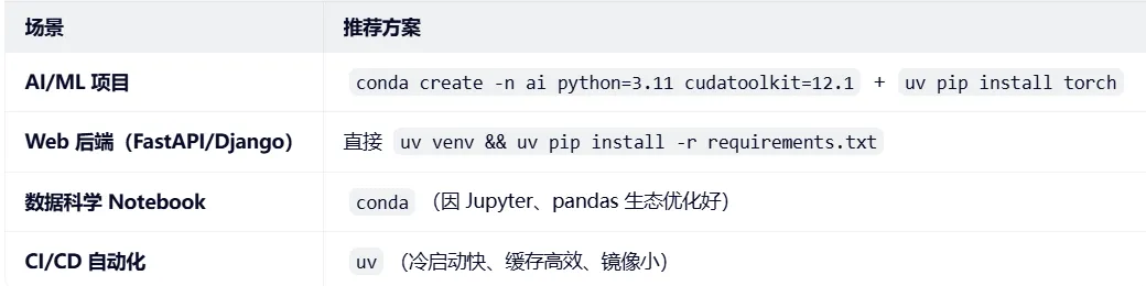 现代最佳实践往往是:conda 管“硬依赖”,uv 管“软依赖”。