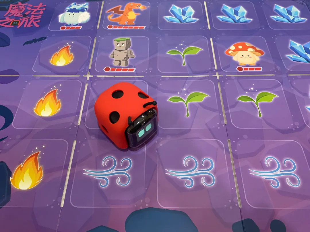 通过编程卡片(重复开始/停止、×2等),指挥小瓢虫机器人在地图上完成“春→夏→秋→冬”的循环路径挑战。
