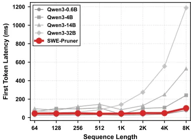 SWE-Pruner的轻量设计使其在8192 token输入下延迟仅102毫秒(图3),而Qwen3-32B模型延迟超1200毫秒。剪枝开销仅占API调用成本的10%,但token减少带来的节省可覆盖此成本。