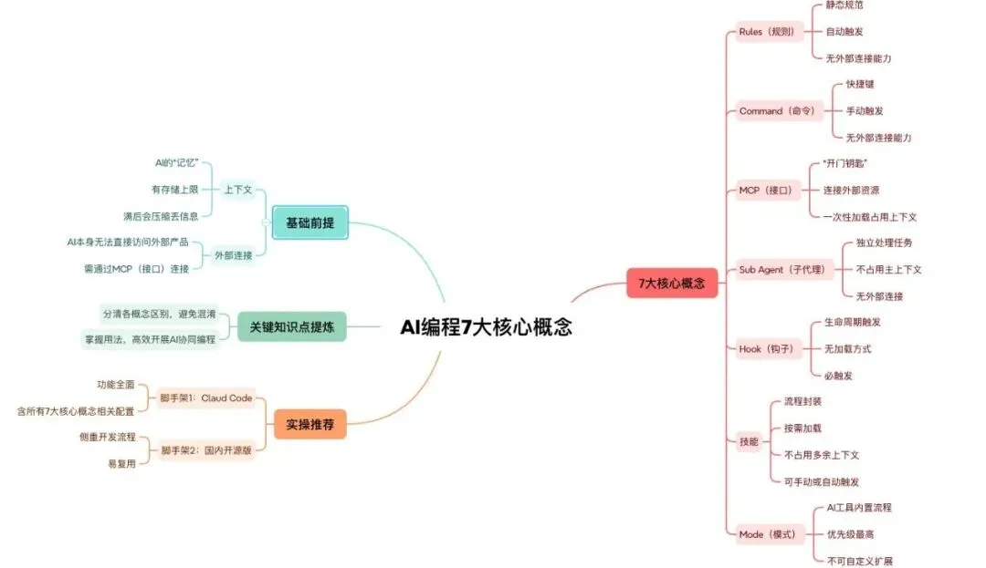 1. 开篇核心:AI编程的7大核心概念易混淆,核心围绕“上下文”和“外部连接”两个前提设计;本文拆解各概念区别和用法,推荐实用脚手架,帮助大家高效开展AI协同编程,避免越用越乱。