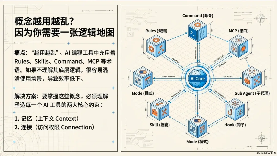 AI发展至今,衍生出了很多AI编程相关的核心概念,哪怕是经常使用AI编程的人,也容易混淆——比如分不清Rules和技能的区别、不知道MCP和Hook的作用、不清楚什么时候该用Command、什么时候该用Sub Agent。