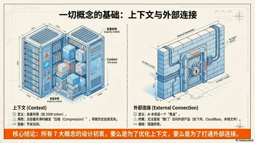 ① 上下文:AI的“记忆”,有存储上限,满后会压缩丢失信息,后续概念优化多围绕节省上下文展开;