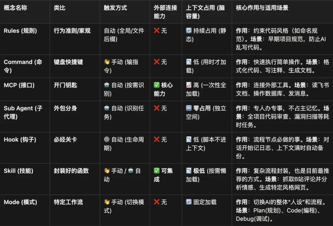 搞懂上下文和外部连接这两个基础前提后,我们开始逐一拆解7大核心AI编程概念。每个概念都从“一句话定义、加载方式、触发方式、核心作用、局限性”五个维度讲解,全程通俗易懂,保留所有实操细节,避免大家混淆。