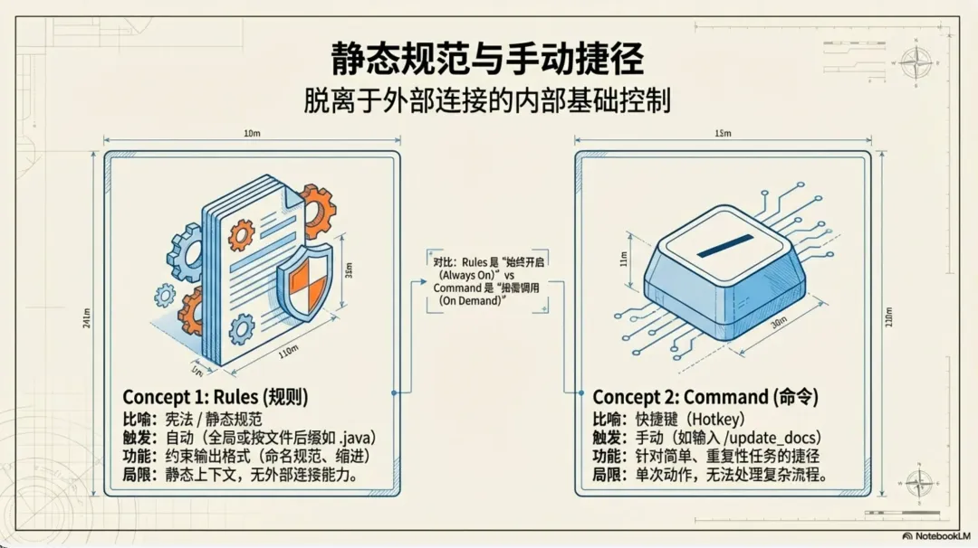 ① Rules(规则):静态规范,自动触发,无外部连接能力,早期用于约束AI代码输出;