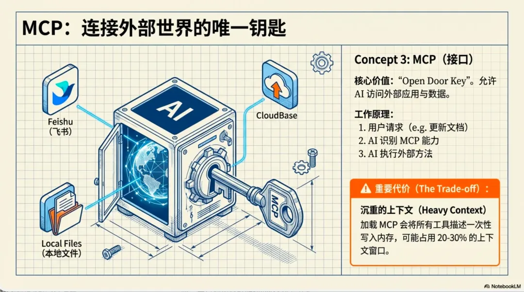 核心作用:解决AI无法直接访问外部资源的问题,让AI能操作外部产品(比如浏览飞书笔记、发布飞书文档、访问CloudBase资源等),是连接AI与外部产品的核心。