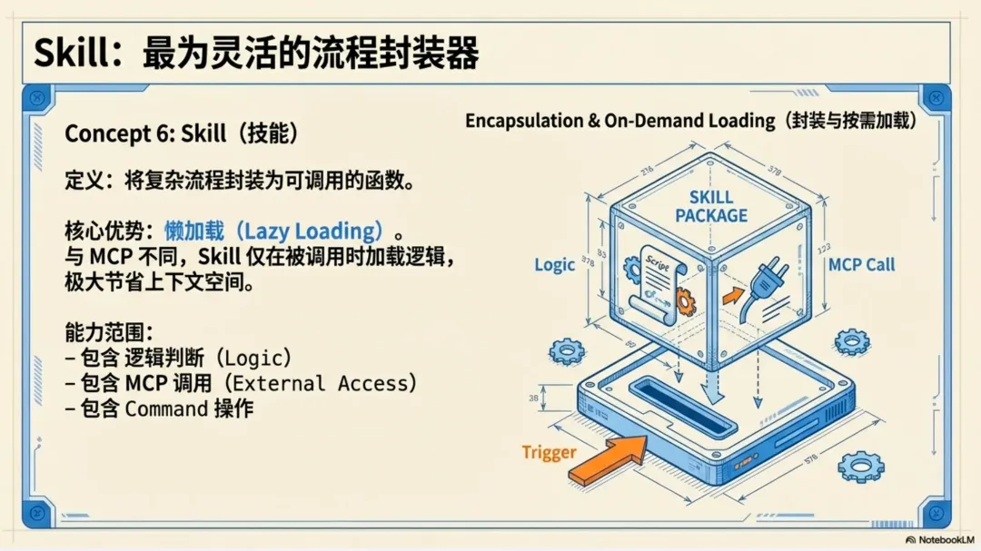 ⑥ 技能:封装复杂流程,按需加载省空间,可集成其他概念功能;