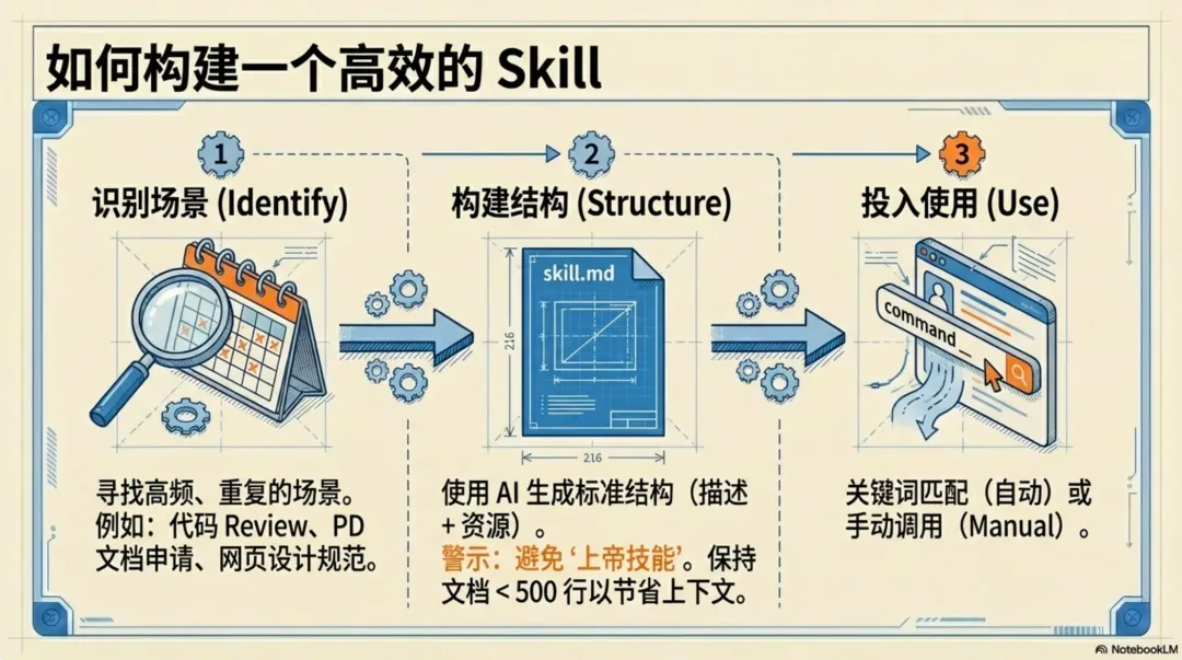 ① 用AI工具自带的“创建技能”功能:很多AI工具(比如Claud Code)都内置了“技能创建器”,可以通过和AI对话,让它帮你生成技能的标准格式(比如说明文档、资源引用),你只需要填入自己的流程细节即可;