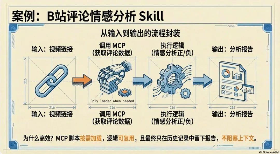 我们可以封装一个“B站视频评论情感分析”技能,用于分析编程相关视频的评论反馈,具体包含两个核心流程:一是调用外部接口(MCP),获取指定B站编程视频的所有评论;二是对评论进行情感打分(正面/负面/中性),生成简单的分析报告。这个技能按需加载,只有需要分析评论时,才会加载对应的调用方法和情感打分标准;且技能中的接口调用脚本,不会加载到上下文,仅暴露“输入视频链接,获取分析报告”的调用方法,调用后直接返回结果,高效又省空间。