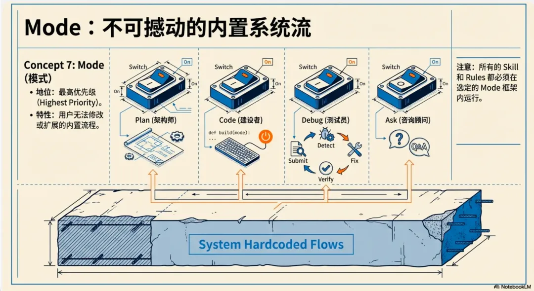 ⑦ Mode(模式):AI工具内置流程,优先级最高,不可自定义扩展。