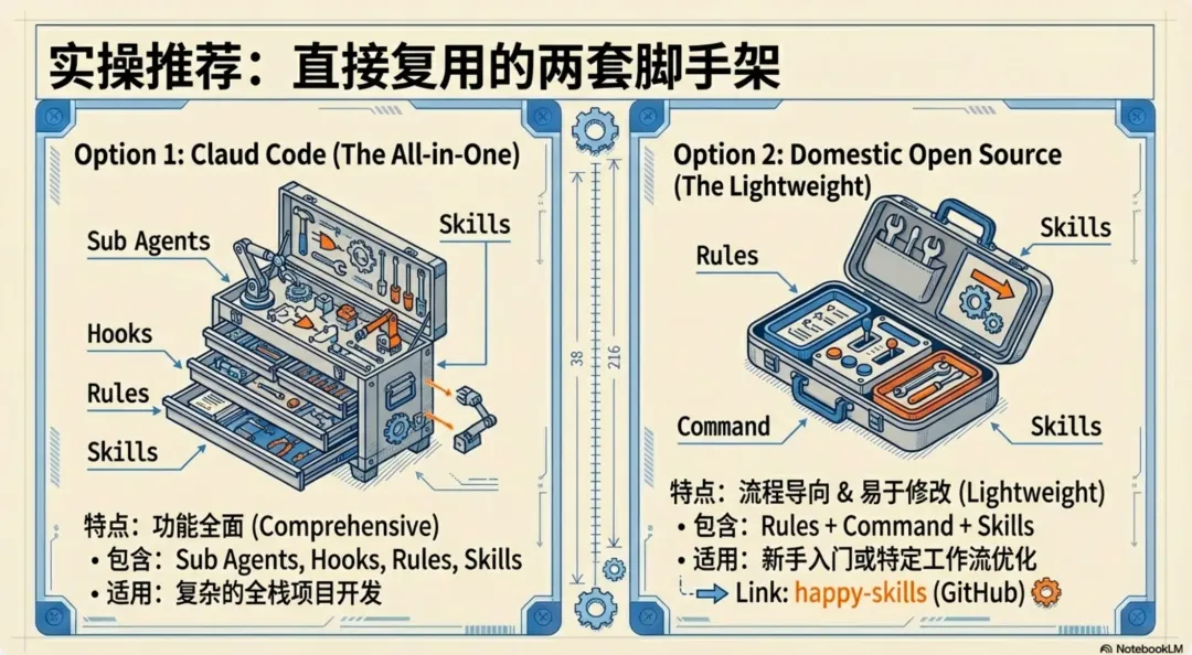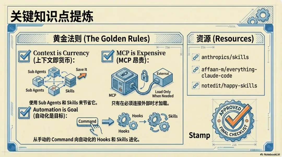 5. 整体总结:7大核心概念虽有功能重叠,但各有专属用途,分清其“加载方式、触发方式、是否有外部连接能力”,即可快速区分用法;结合推荐的脚手架配置,可大幅节省配置时间,提升AI协同编程效率;AI编程的未来方向是自动化,各类概念的优化都在向“自动化编程”靠拢。