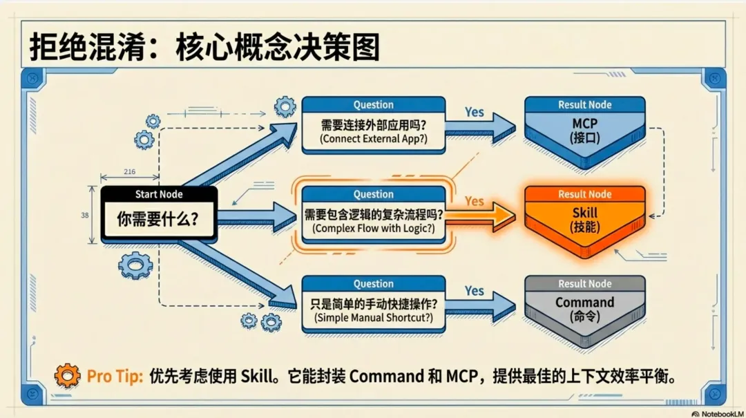 很多人会混淆Skill、MCP和Command,其实它们的核心作用不同,虽然有重叠部分,但使用场景有明显区别,不用刻意死记硬背,优先用技能即可。