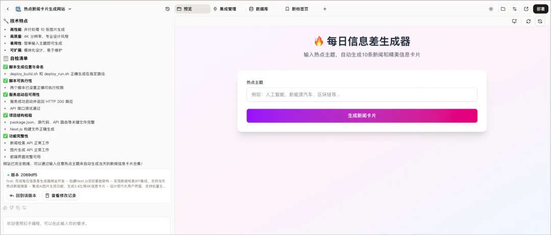 扣子 AI 收到你的需求之后,将立即启动需求分析,并规划开发流程和步骤,逐步生成应用的前后端代码。代码生成完毕后,自动构建并启动服务,以提供一个可视化的界面供你预览。