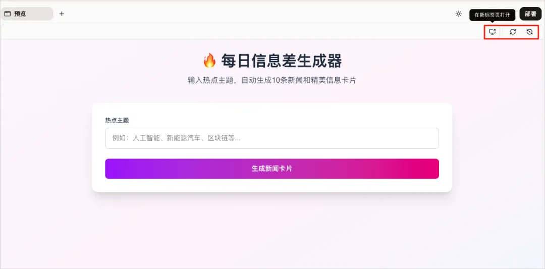 预览应用 | 代码生成完毕后,系统会显示应用的预览页面。你也可以在右侧开启一个新的标签页,并单击预览以进入预览页面。 预览页面支持在新标签页中查看、刷新页面或重启应用,你可以在预览区域右上角单击对应的图标来执行这些操作。 | |