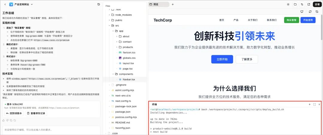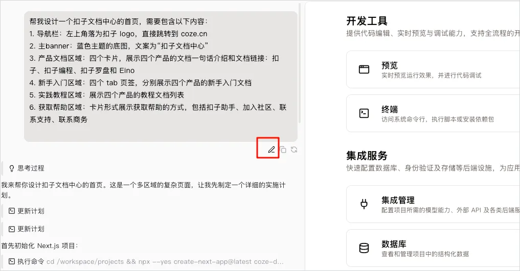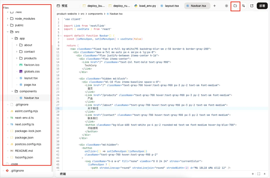 手动编写代码 | 在页面右上角单击文件树图标进入代码编辑器,你可以在其中查看扣子 AI 生成的所有代码文件,并直接修改代码。 修改代码之后,需要重新构建才能预览项目。你可以在终端中执行命令,或者通过对话请扣子 AI 帮你构建、重启服务,以供预览项目。 | |
