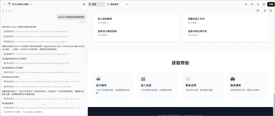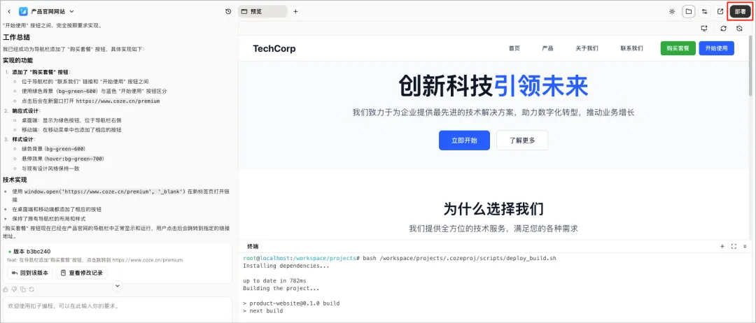 完成应用的开发与测试之后,你可以在页面右上角单击部署,将扣子编程搭建的应用部署成为一个公开可访问的在线项目,将你的创意和原型,转化为服务于真实用户的产品。详细操作步骤可参考部署网页应用。