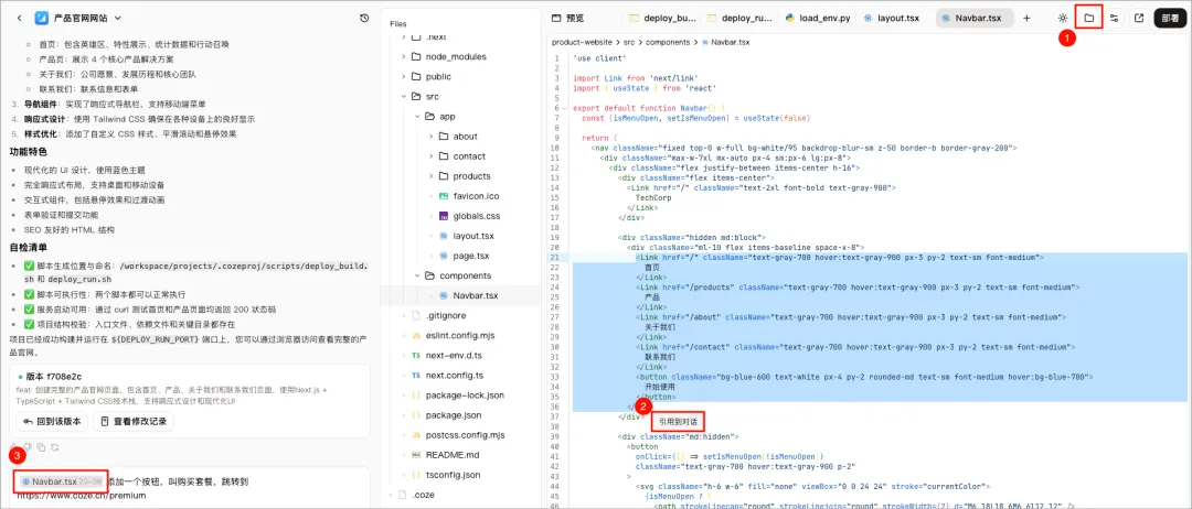 通过扣子 AI 修改代码 | 在页面右上角单击文件树图标进入代码编辑器,找到你想修改的前端代码文件或代码片段,并单击引用到对话,然后通过自然语言描述你的修改建议。 | |