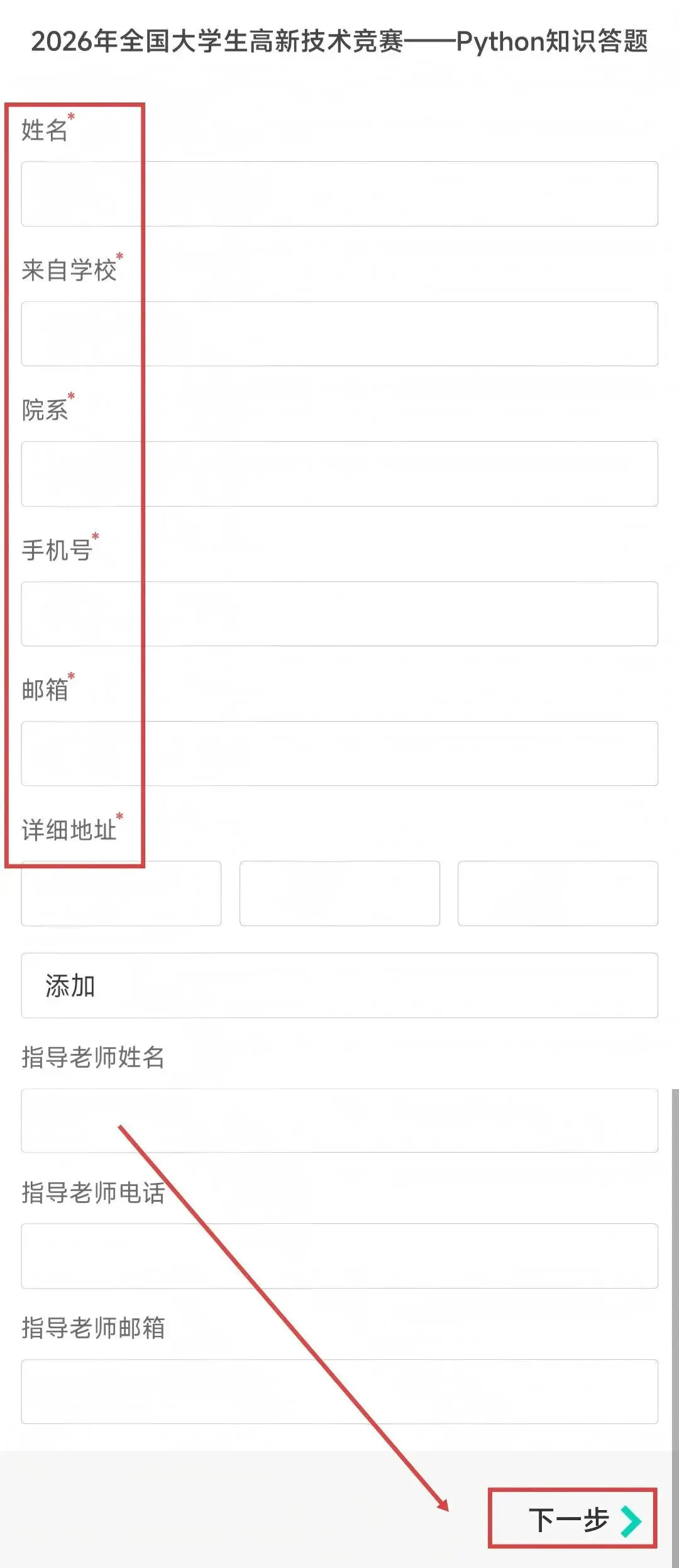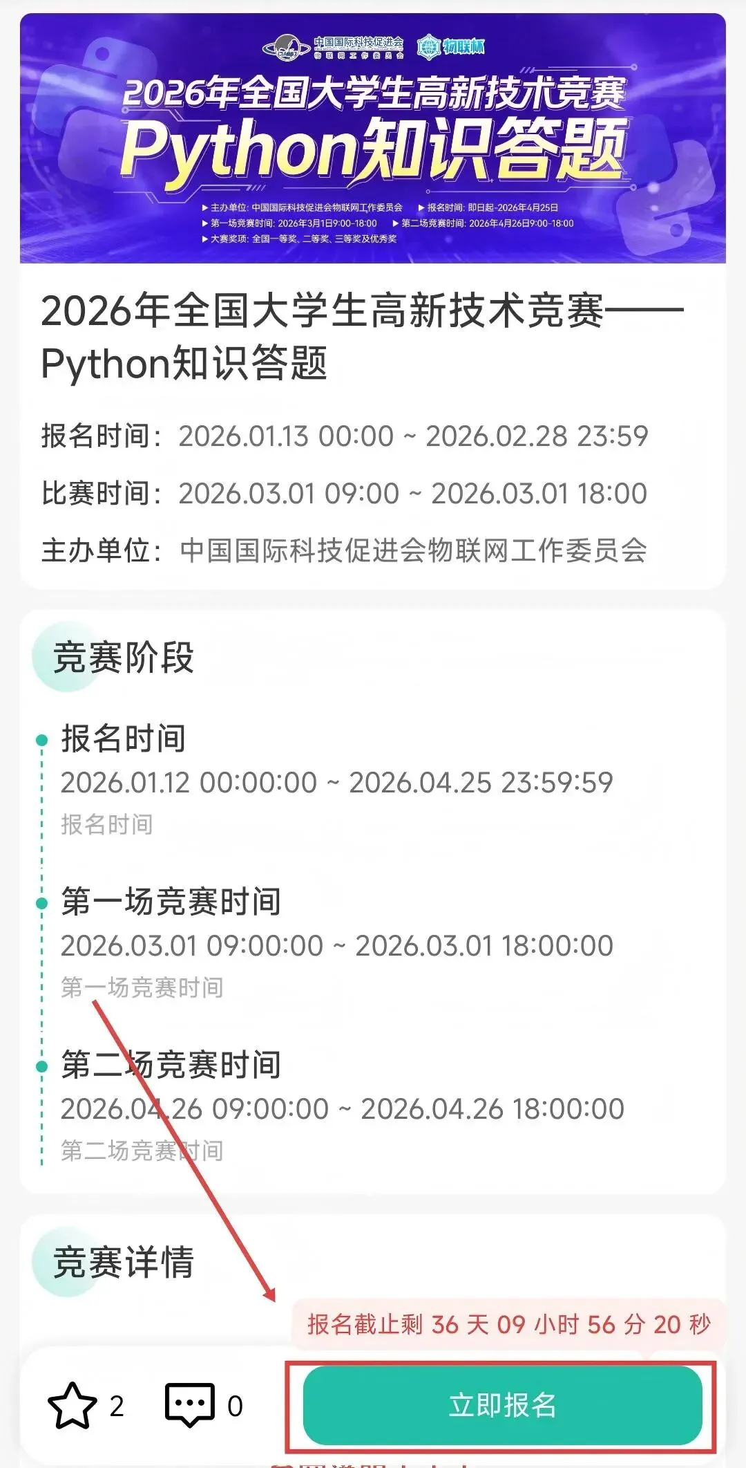 2026年全国大学生高新技术竞赛——Python知识答题 是由国家一级社团分会-中国国际科技促进会物联网工作委员会主办,竞赛于2026年3月-4月期间分两场进行,报名后可根据自身学习情况自行选择一个场次参加。现报名正在进行中,第一场考试将于2026年3月1日开展,各位参赛者可以参考以下流程完成报名。