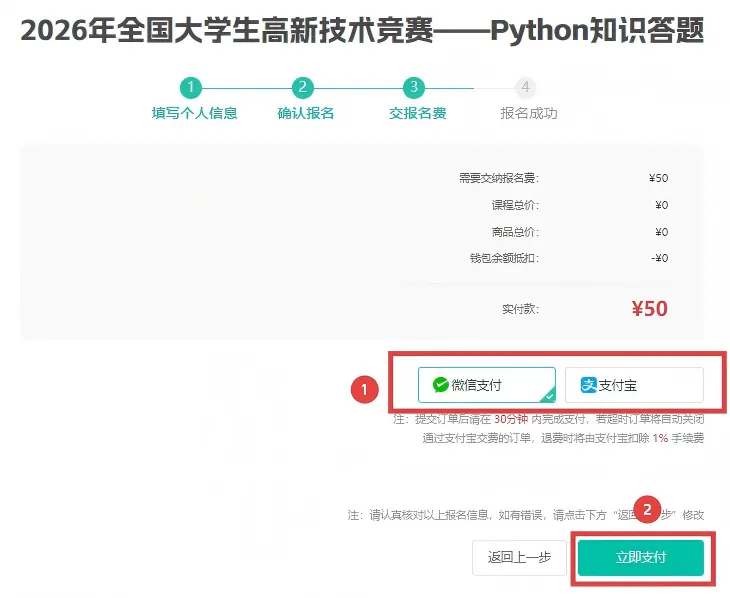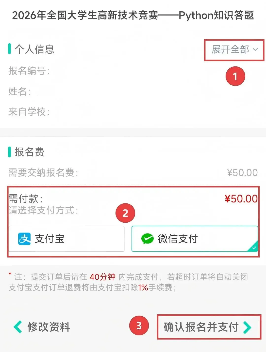4、展开全部确认报名信息,确认无误后选择支付方式进行支付即可