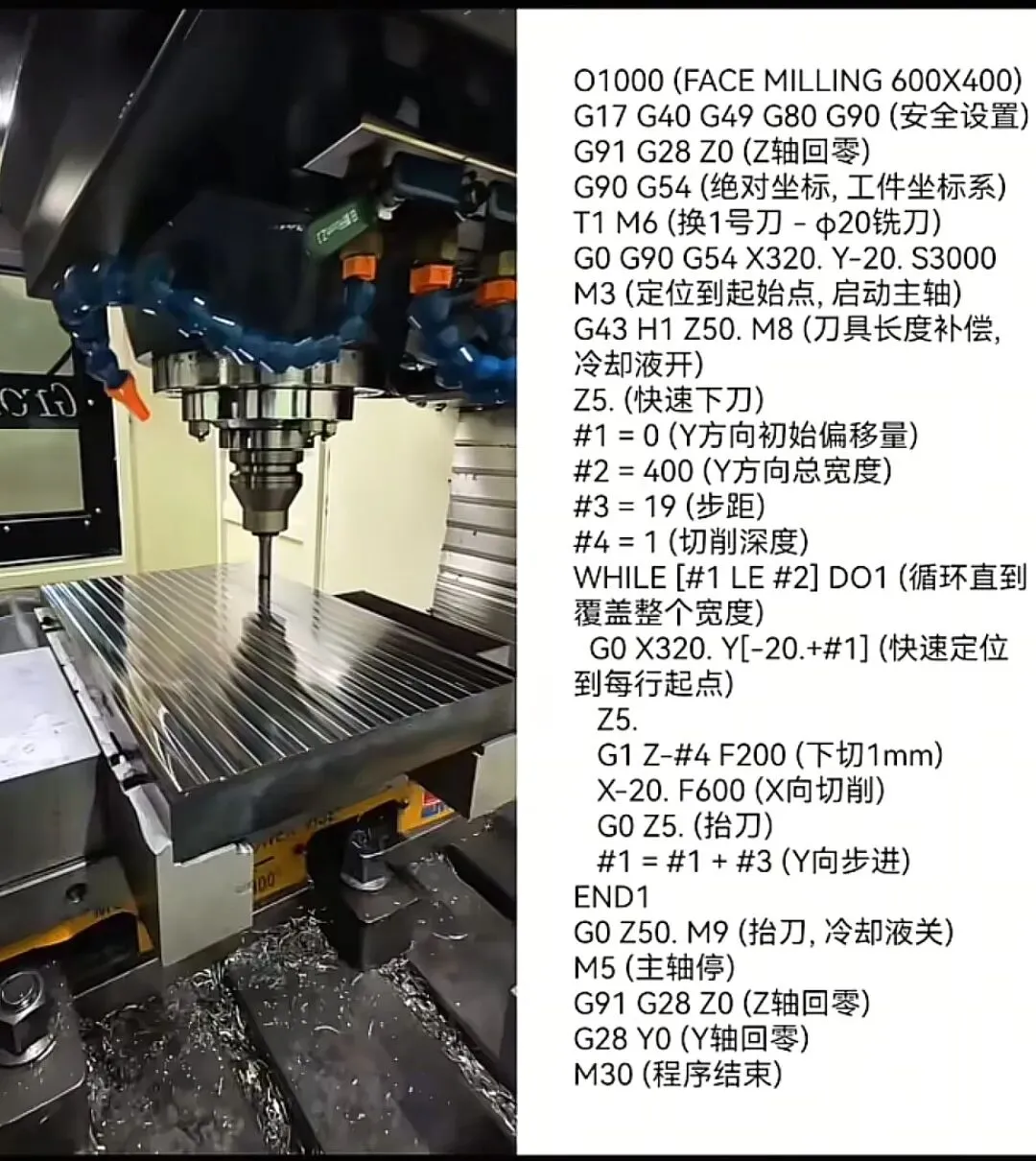 图中机床正进行面铣作业:蓝色冷却液飞溅、刀具匀速切削、铝屑有序排出…看似简单的“平面加工”,实则是一套精密数控程序在指挥机床动作。接下来,我们逐行拆解程序,解锁每一步指令的“隐藏含义”!
